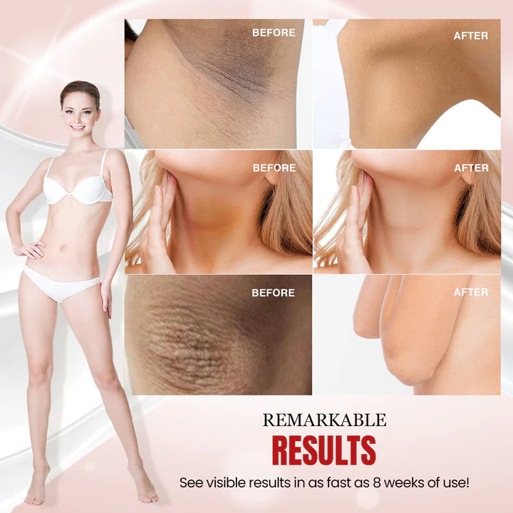 Adequado para diferentes tipos de pele: Um creme especialmente criado para ajudar a tratar o aspeto das zonas descoloradas, melhorando o aspeto geral da pele sensível, como as axilas, as zonas íntimas, as mãos, o peito, os joelhos, os cotovelos e o rosto. Corrige os depósitos de melanina causados por bronzeamento, hormonas ou depilação.